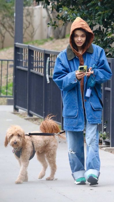 22 April 22, 2025 Rachel Zegler Rachel Zegler in a Blue Denim Jacket Walks Her Dog in New York City 04/21/2025