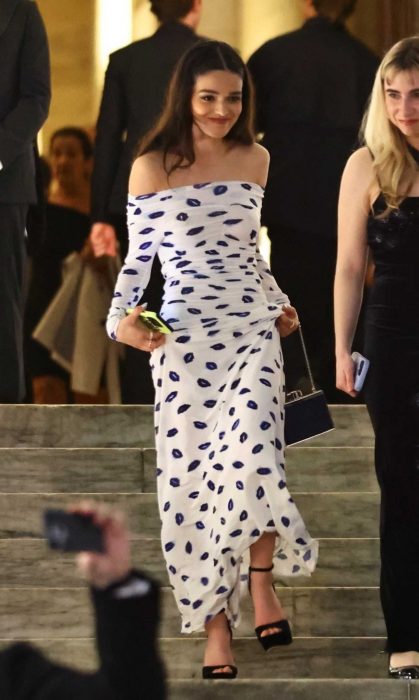7 April 7, 2025 Rachel Zegler Rachel Zegler in a Lips Print White Dress Leaves NY Public Library for George Clooney’s Play After Party in New York City 04/04/2025